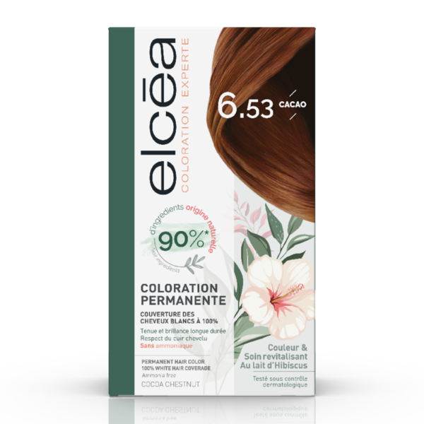 ELCEA Cacao – 6.53 est une coloration permanente avec 90% d’ingrédients d’origine naturelle, enrichie en Lait d’Hibiscus. Elle assure la couverture des cheveux blancs avec une excellente tenue dans le temps et respecte le confort du cuir chevelu.